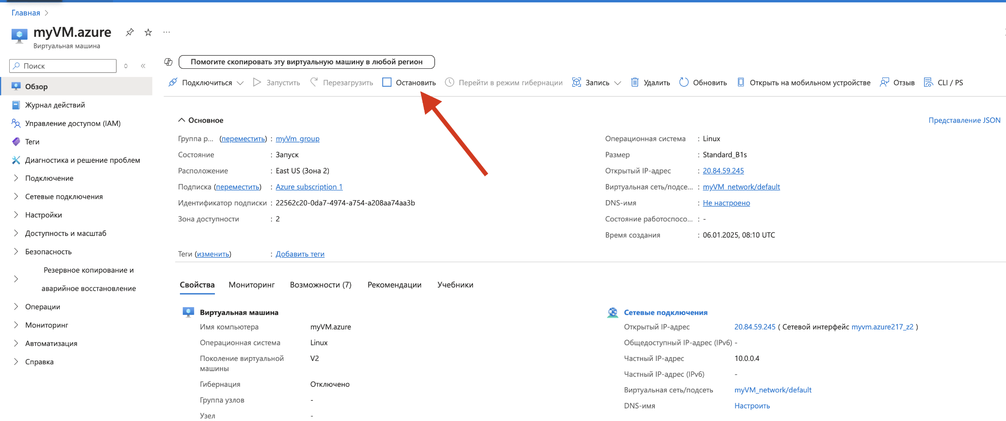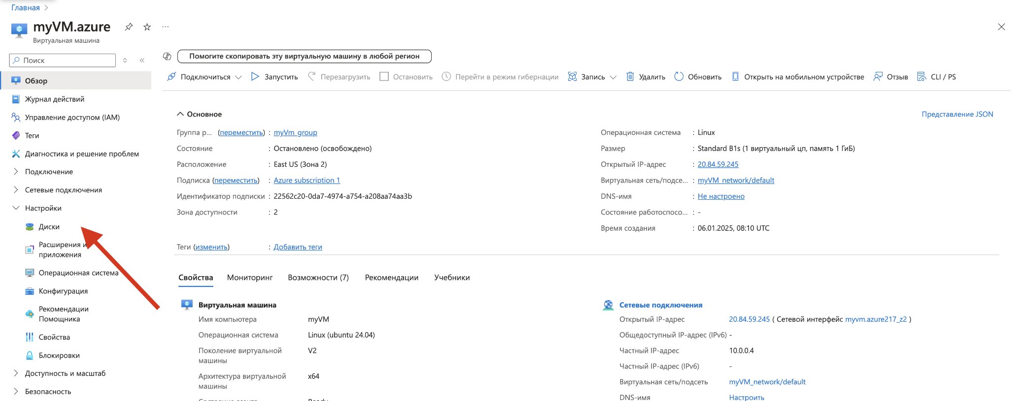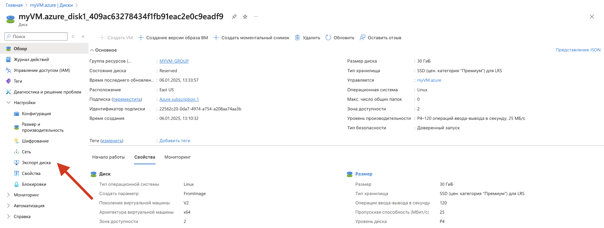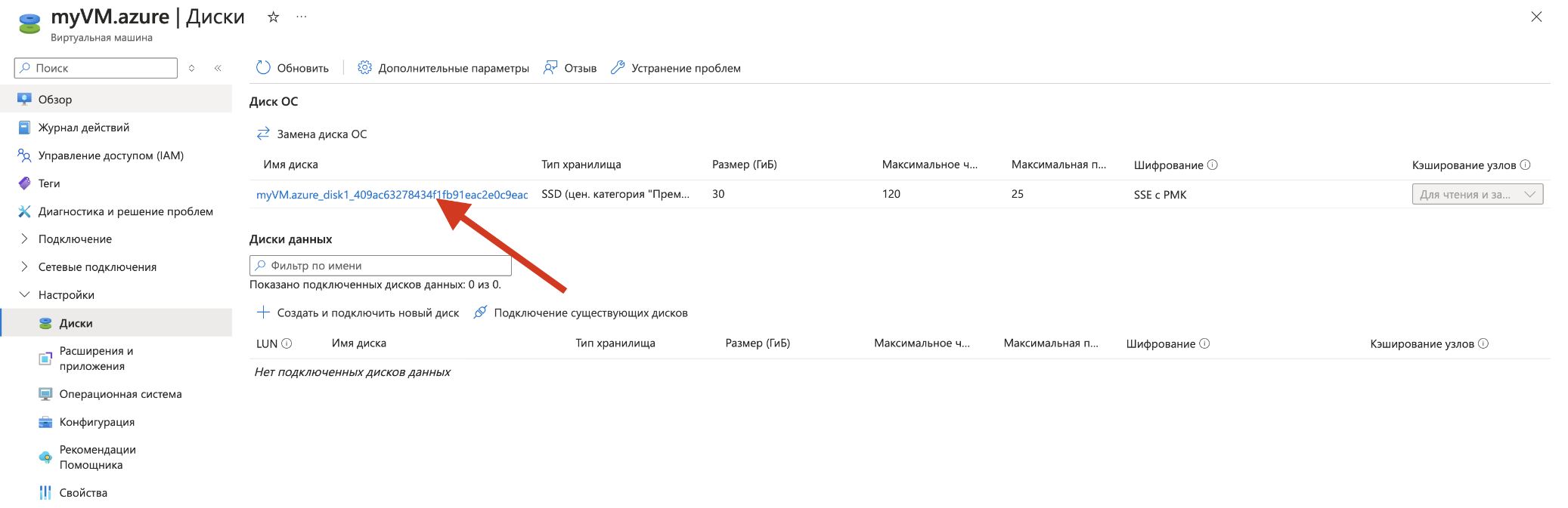 Кликните на OS Disk (ОС-диск) виртуальной машины.